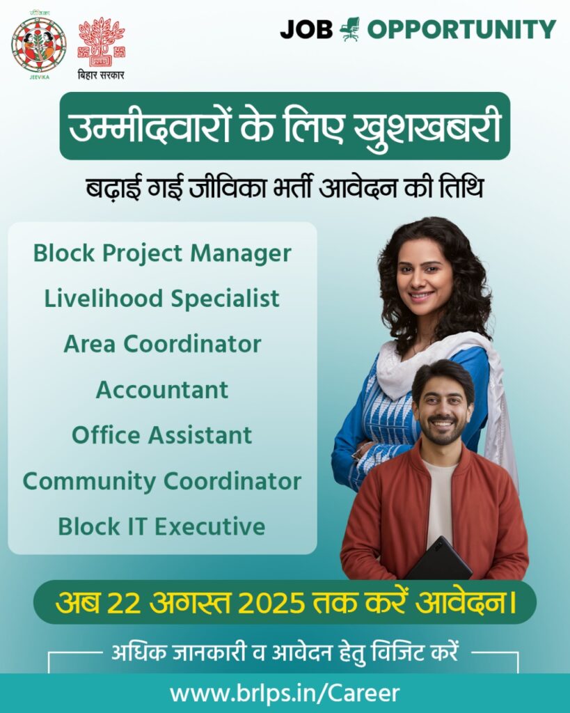 BRLPS Jeevika Bharti 2025 : बिहार जीविका नई भर्ती को लेकर विज्ञापन जारी किया गया है। सुयोगय उम्मीदवार इस पद के आवदेन कर सकते है। ऑफिसियल नोटिफिएशन जारी कर जानकारी दिया गया है। अगर आप इस पद के लिए आवेदन करना चाहते है तो ऑनलाइन के माध्यम से फॉर्म को भरना होगा। इसमें योग्यता , उम्र सीमा पदों की विवरण, सभी का जानकारी के लिए इस आर्टिकल को पद सकते है।