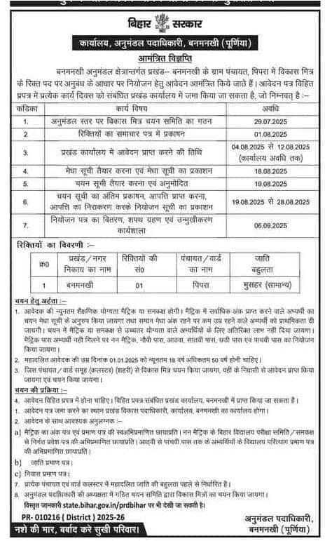 Vikas Mitra Vacancy 2025 : बिहार में विकास मित्र के पदों पर नई भर्ती निकाली गई है | ये भर्ती पूर्णिया जिले के बनमनखी अनुमंडल क्षेत्रान्तर्गत प्रखंड-बनमनखी के ग्राम पंचायत, पिपरा में Vikas Mitra Vacancy 2025 निकाली गई है। इसका ऑफिसियल नोटिफिएशन जारी कर जानकारी दिया गया है। अगर आप इस पद के लिए आवेदन करना चाहते है तो पदों की विवरण सभी जानकारी के लिए इस आर्टिकल को पढ़ सकते है।
